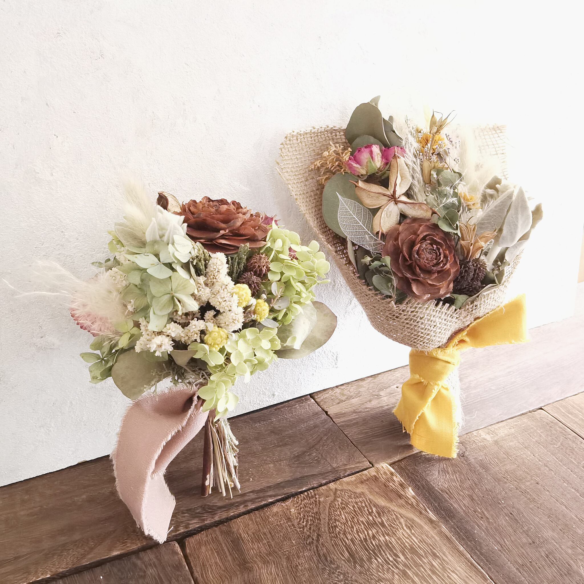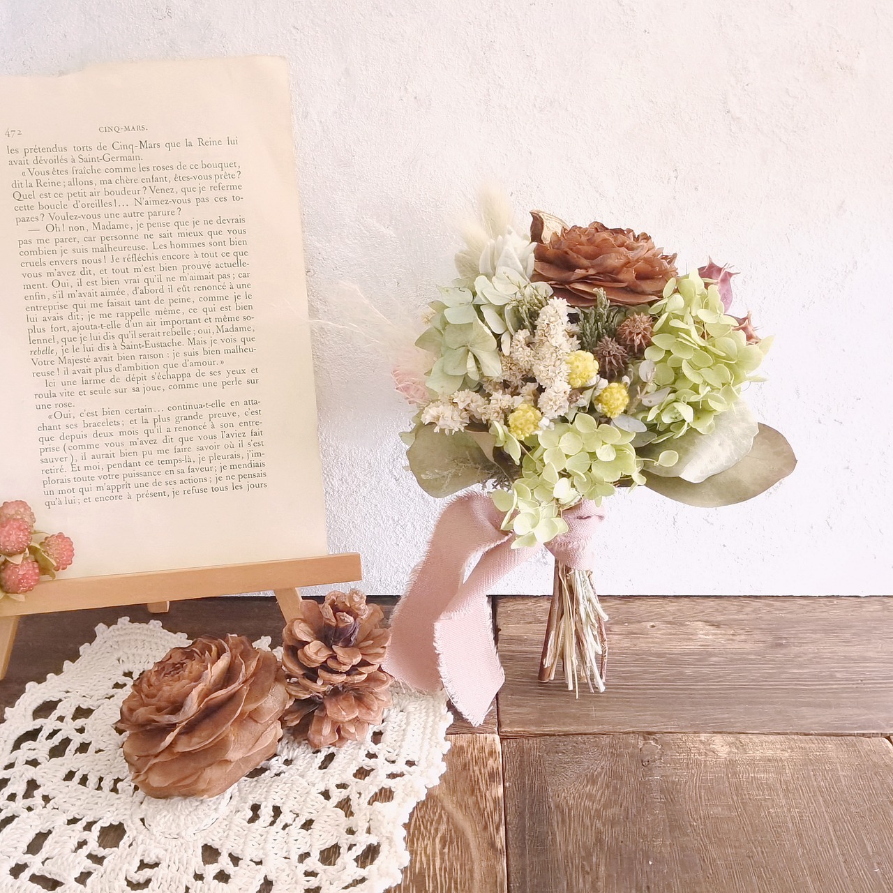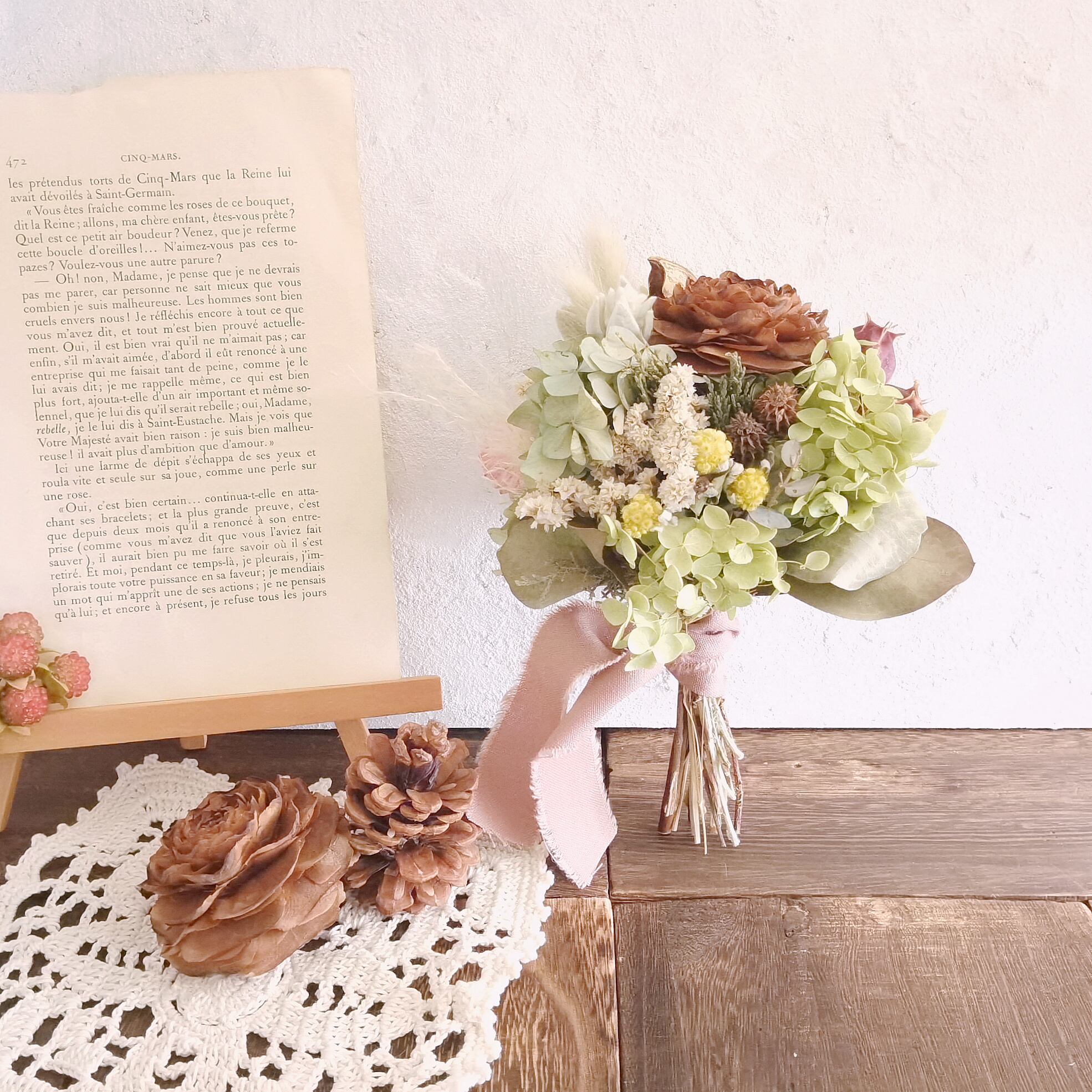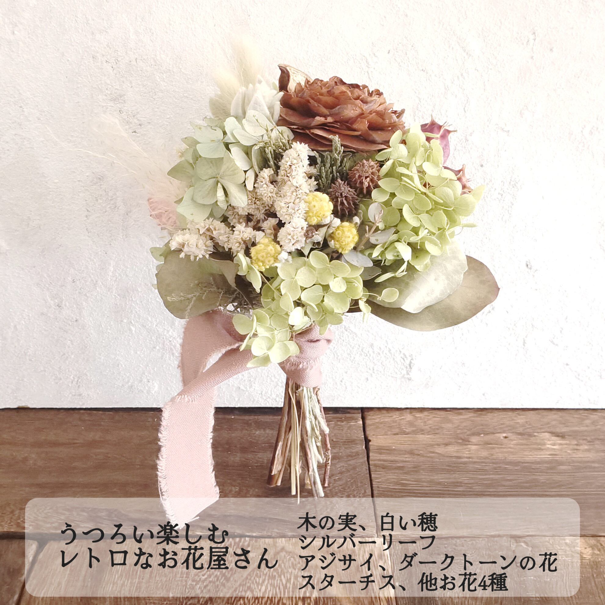 ・うつろい楽しむレトロなお花屋さん ナチュラルドライのお花だけで作る、ラウンドブーケです。染花無しなので退色していく過程を楽しめます