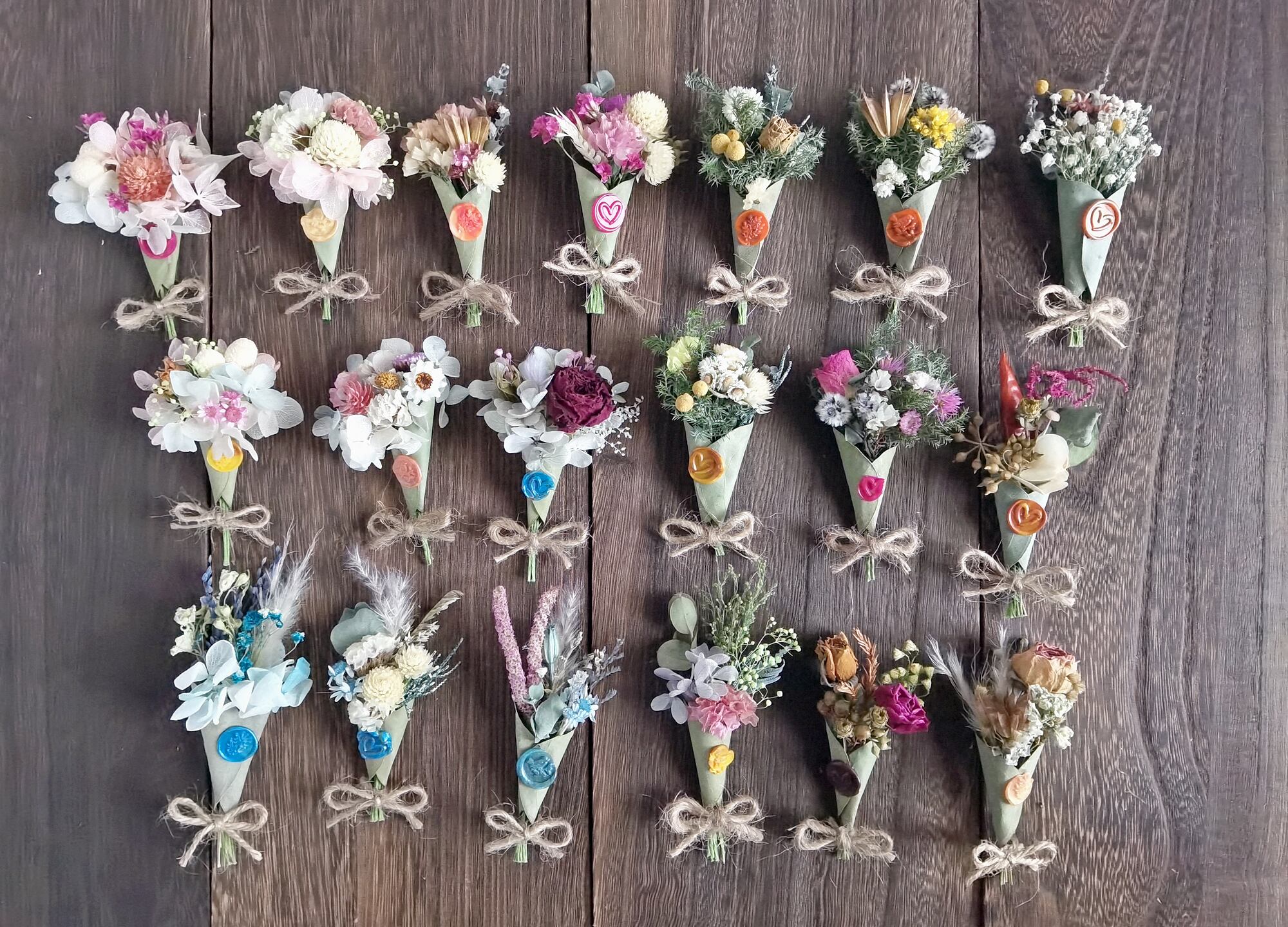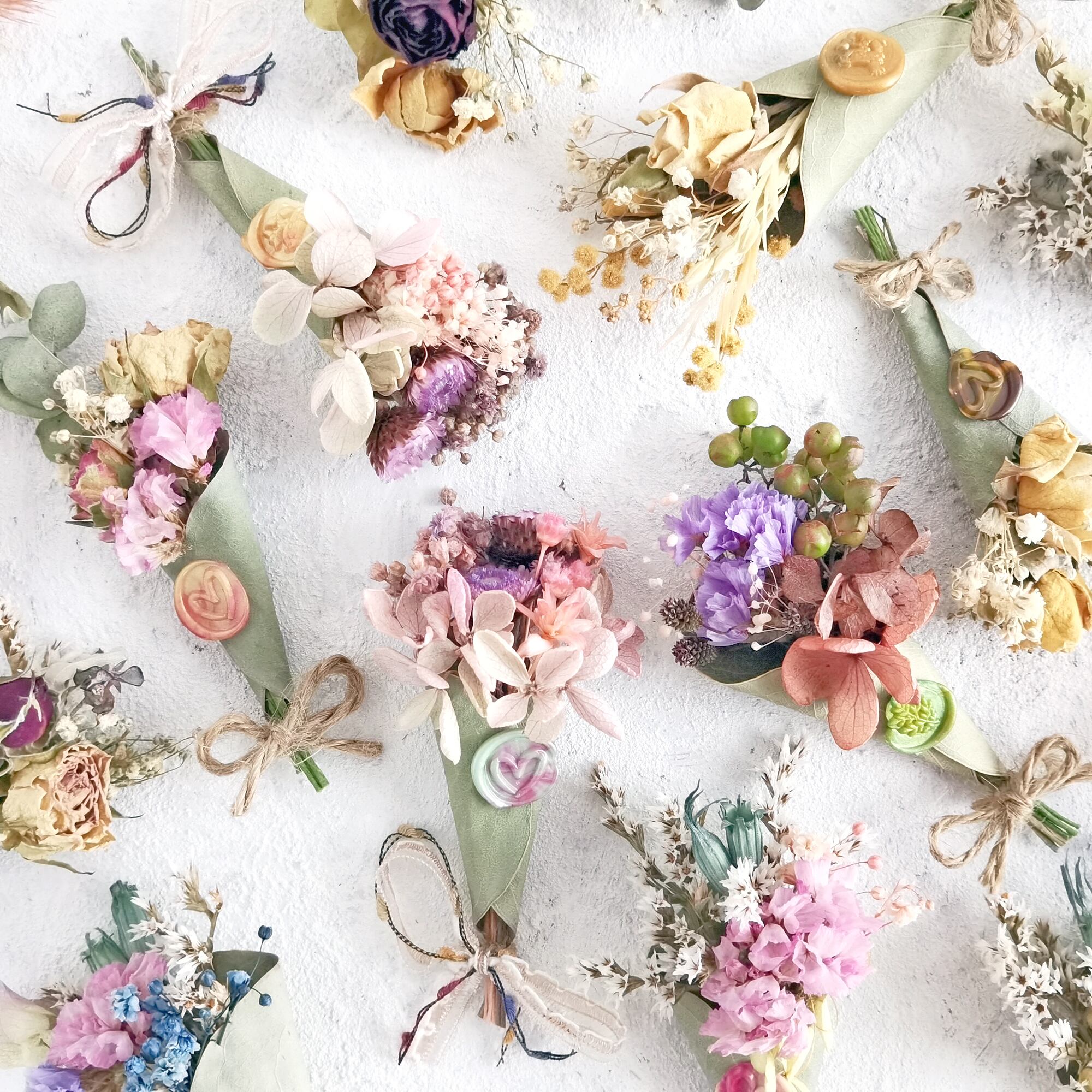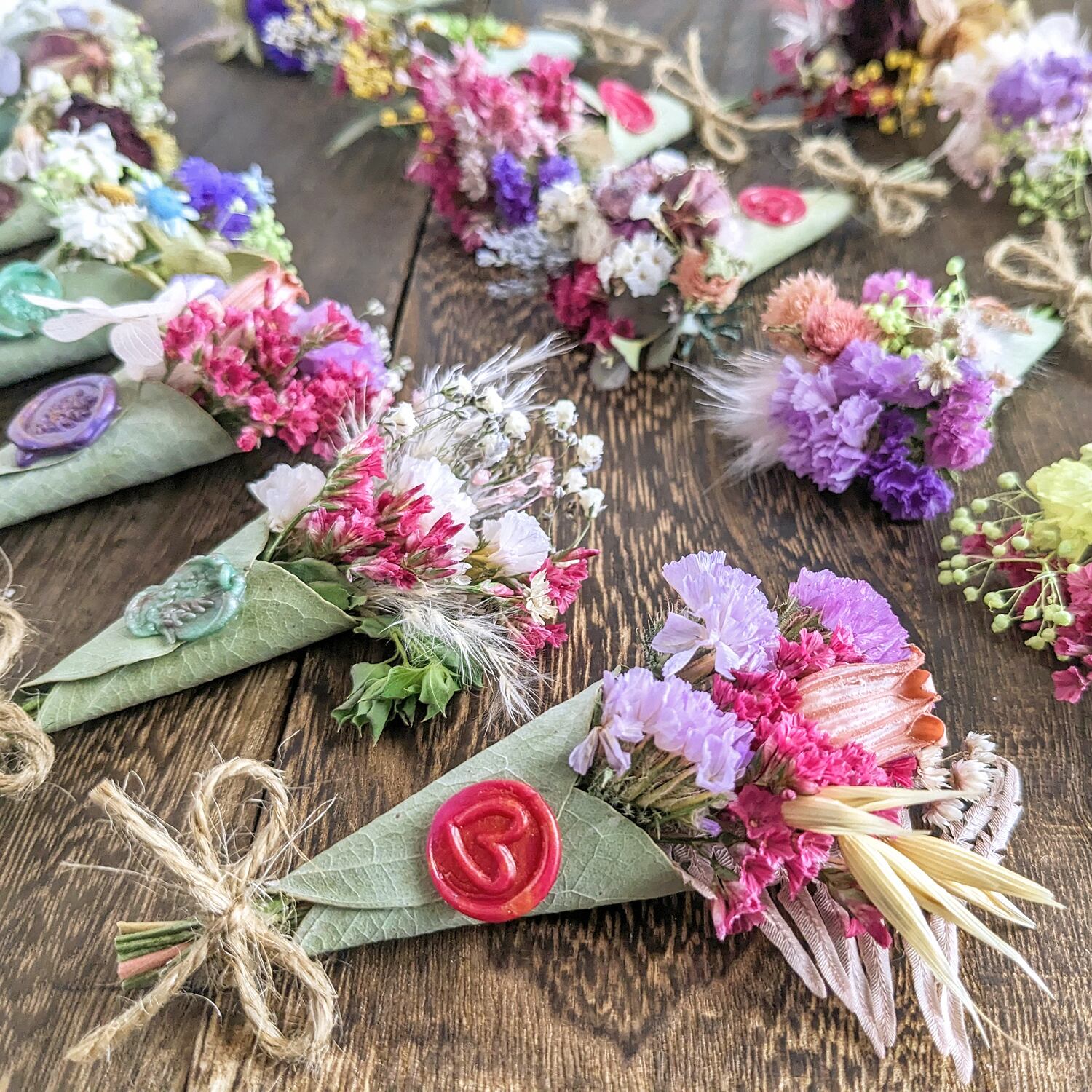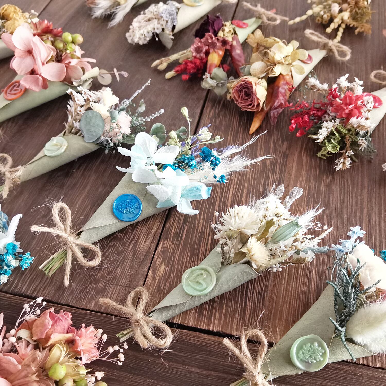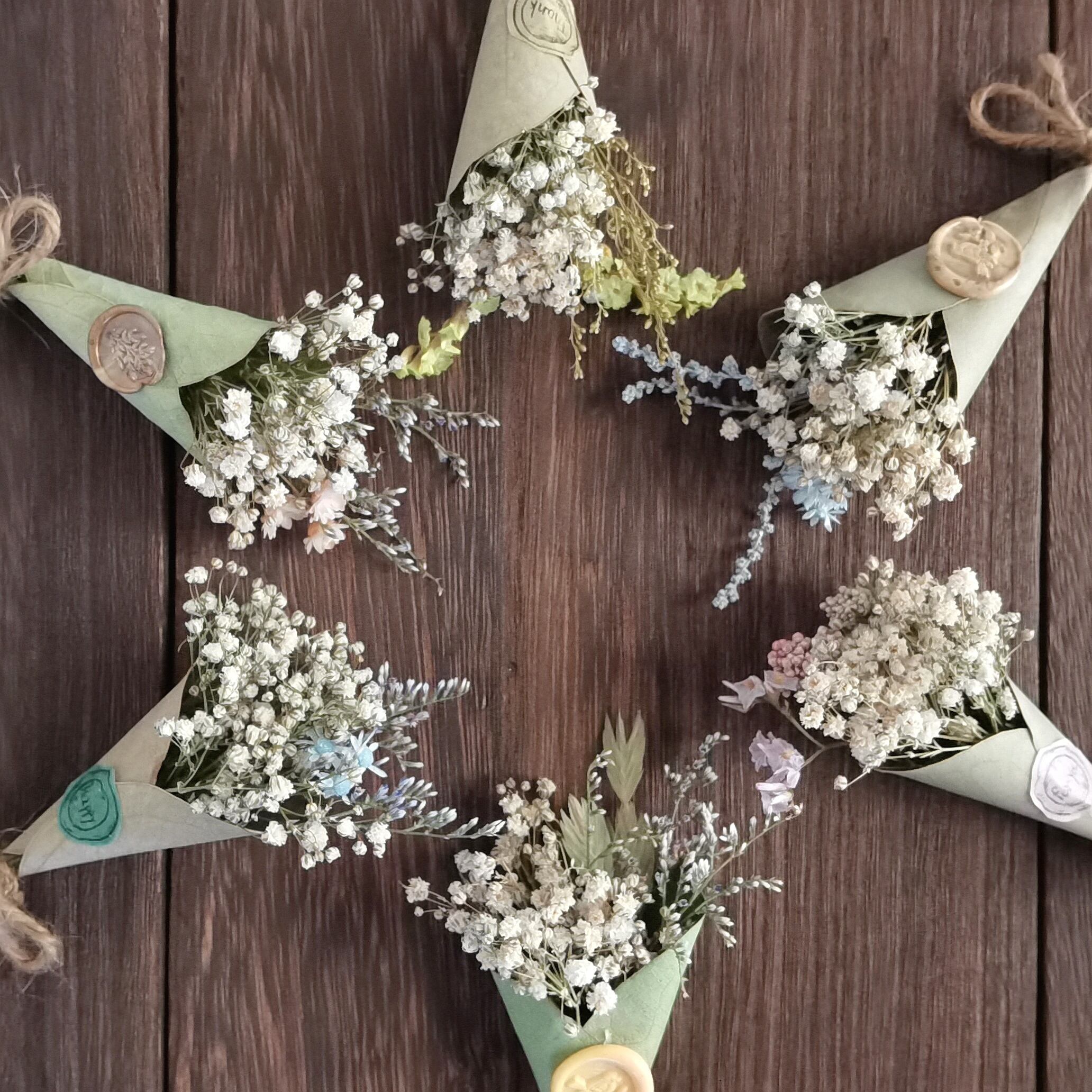 ポイントには、ドライフラワーと相性抜群のシーリングスタンプを付けています。