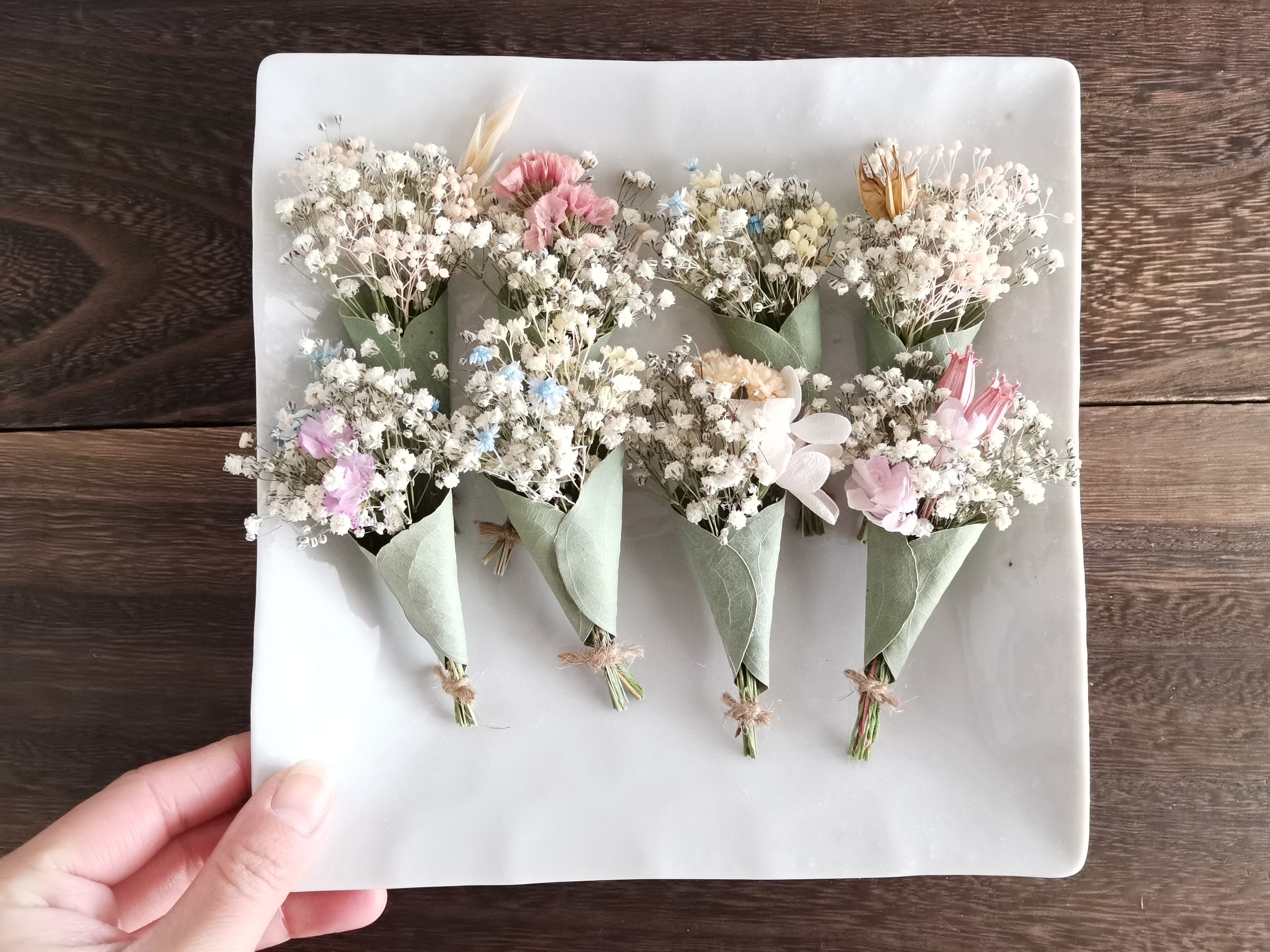 ドライフラワーのミニブーケを本物の葉でくるっとラッピングした、手の平サイズブーケです。